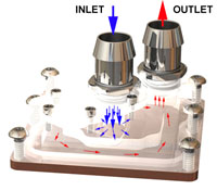 The housing is CNC machined out of brass, and designed for impingement cooling over the CPU hottest area. The flow path, as illustrated above shows that the Apogee™ XT is port specific: inlet and outlet cannot be interchanged.